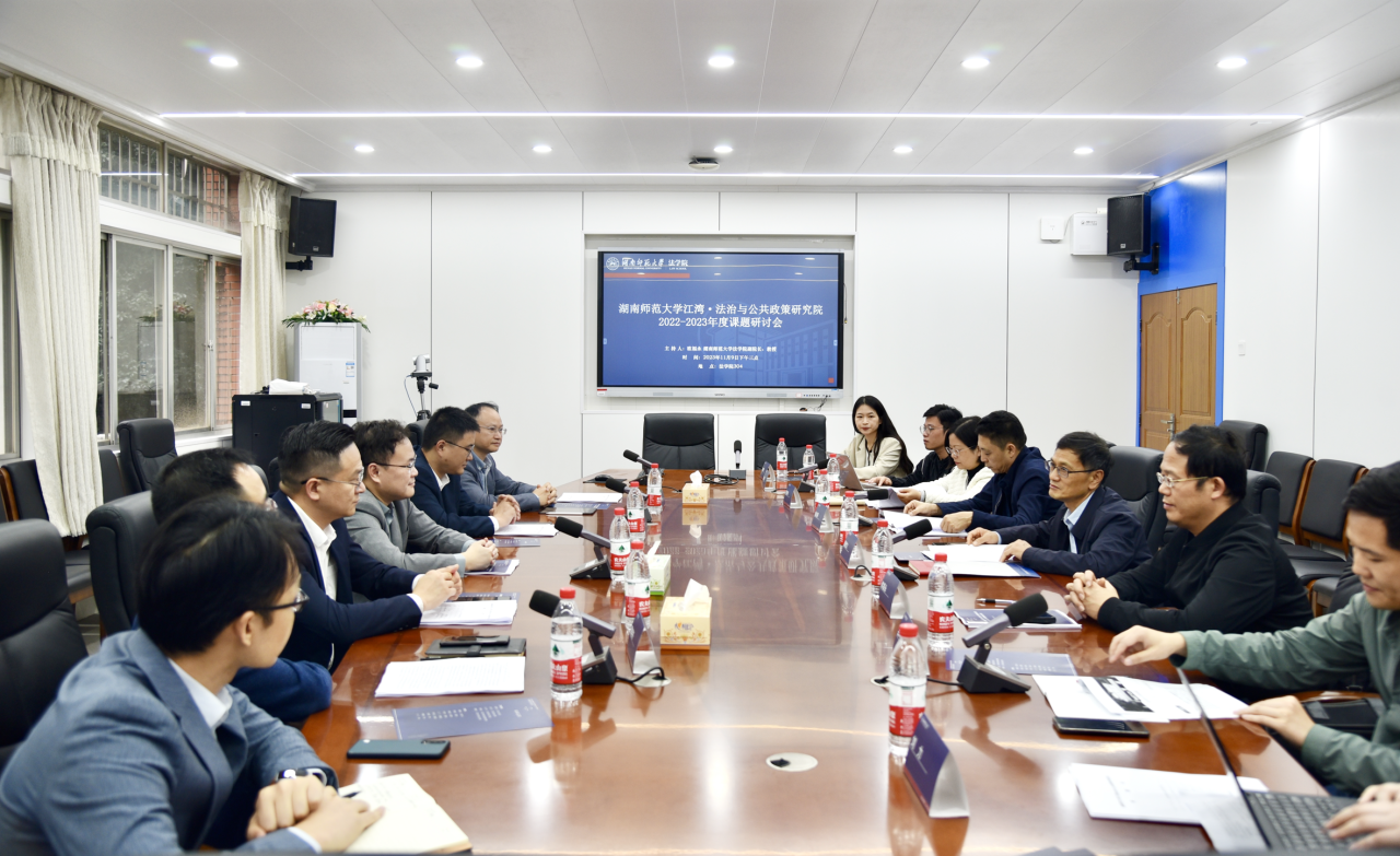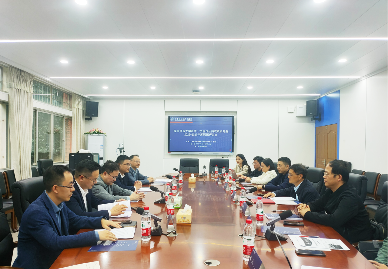 2023 年 11 月 9 日下午,湖南师范大学江湾法治与公共政策研究院 2022-2023 年度课题研讨会在法学院召开。会议由法学院副院长欧福永教授主持,法学院党委书记唐建文、法学院耿自强副院长、何燕华副院长及吕宁副教授、朱兵强副教授、刘湘琛博士、肖珊珊博士、刘力博士等有关课题组专家和江湾集团行政人事总监颜文渊、江湾医院总经理余志华、江湾医院医疗院长周爽、江湾生物科技首席科学家刘雄昊教授、江湾生物科技总经理谭晓冬等参加了此次会议,共同对相关课题进行了评议。会议开始,欧福永教授发表了简短的欢迎致辞,对江湾集团各位领导的到来表示热烈欢迎,并着重介绍了本次课题研讨会的有关议程和具体目标。