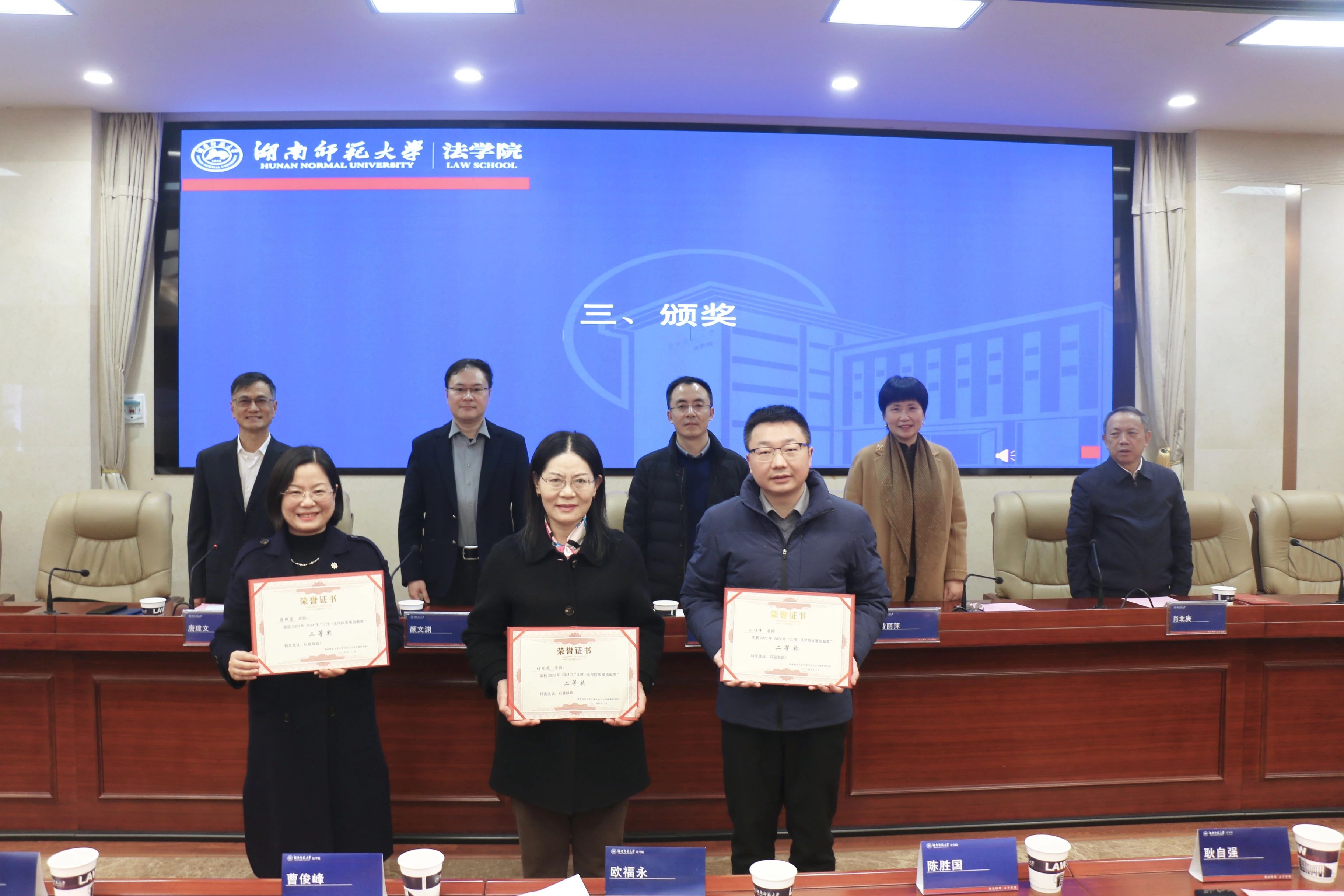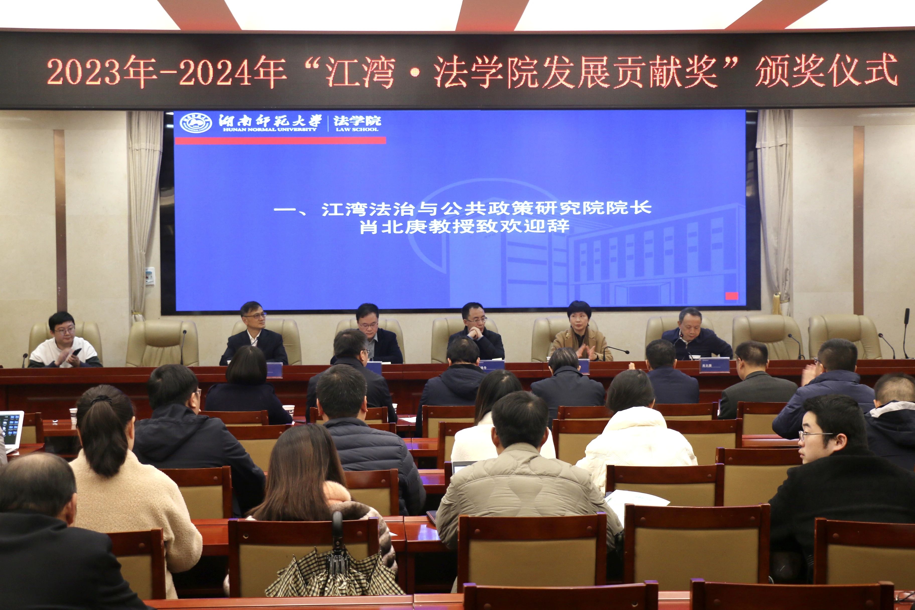 2024年12月5日,湖南师范大学江湾法治与公共政策研究院2023~2024年度“江湾·法学院发展贡献奖”颁奖仪式在湖南师范大学法学院顺利举行,会议由湖南师范大学法学院党委书记唐建文主持。湖南师范大学校友总会秘书长黄丽萍、湖南师范大学江湾法治与公共政策研究院院长肖北庚,法学院领导陈胜国、欧福永、耿自强、曹俊峰、周刚志、何燕华,以及江湾集团人事行政总监颜文渊、江湾生物总经理谭晓冬等领导、专家、学者共同参加了此次颁奖仪式。
