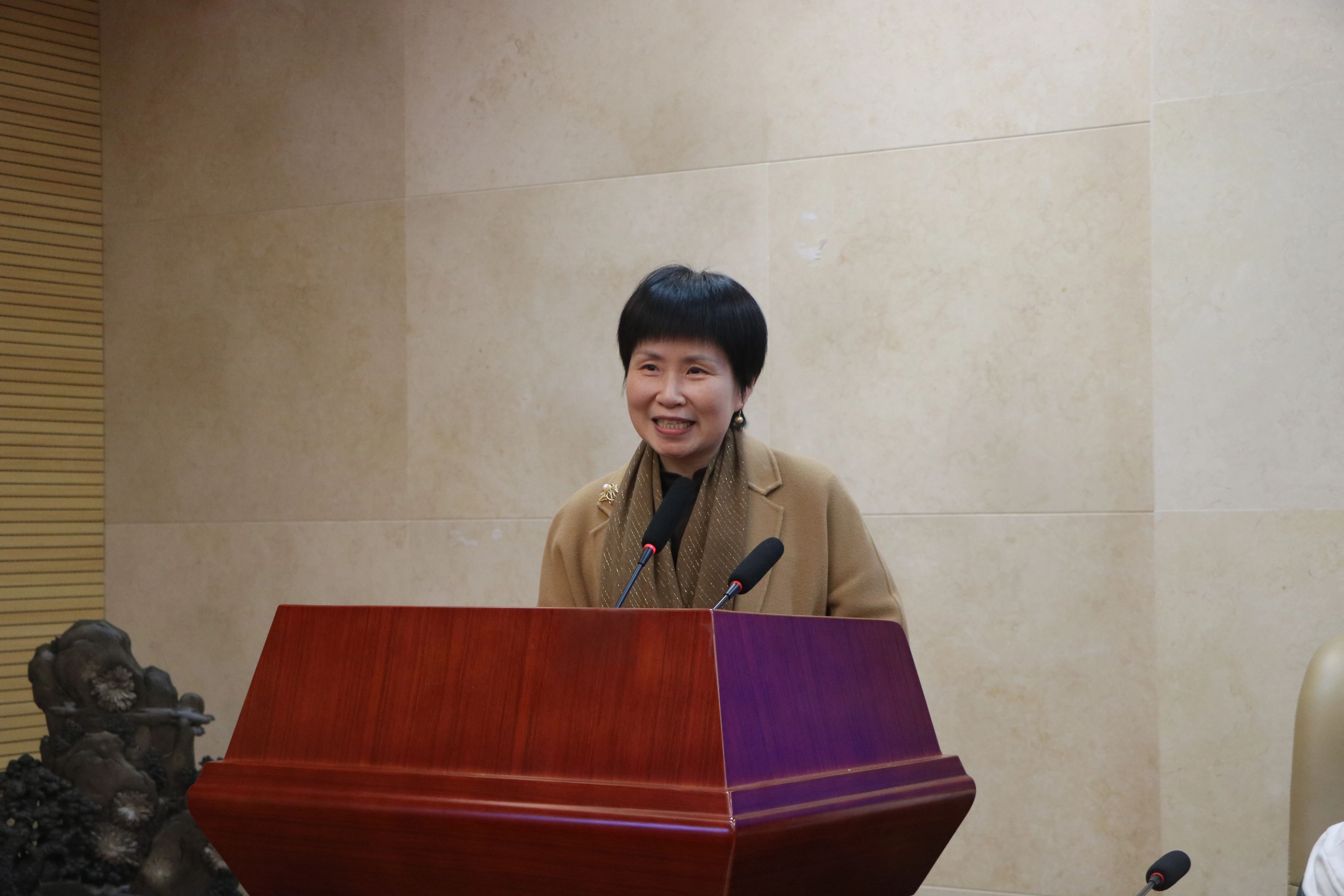 湖南师范大学校友总会秘书长黄丽萍发言。她首先向各位获奖学者表示了热烈的祝贺,并指出湖南师范大学法治与公共政策研究院的设立,是校友单位与母校间展开良性互动的现实典范,双方以此为平台纽带,合作共赢、互惠互利,取得了非常显著的成效。希望研究院能够不断汇聚优势资源,助推产学研深度发展,取得更大实效。